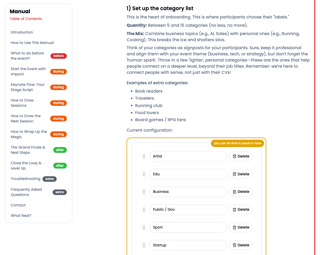 Most tools provide instructions as a PDF or a separate help page. That's a design mistake—it forces users to switch context and lose their flow at the exact moment when they're most focused. In Coffideas, the manual is an integral part of the application and works in a truly unique way: